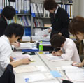 皆さんに指導する講師が、指導する単元の研究・予習をするブースです。休憩時間には生徒とのコミュニケーション作りの場にもなり、いつも楽しい雰囲気です。